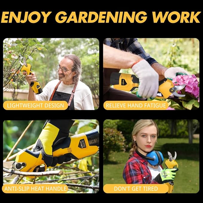 - High-Efficiency Brushless Motor – Prune Faster Than Ever: Equipped with a powerful brushless motor, this electric pruning shear delivers up to 5 times more cutting efficiency, longer service life, and lower noise. Effortlessly slices through thick branches like cutting through butter.