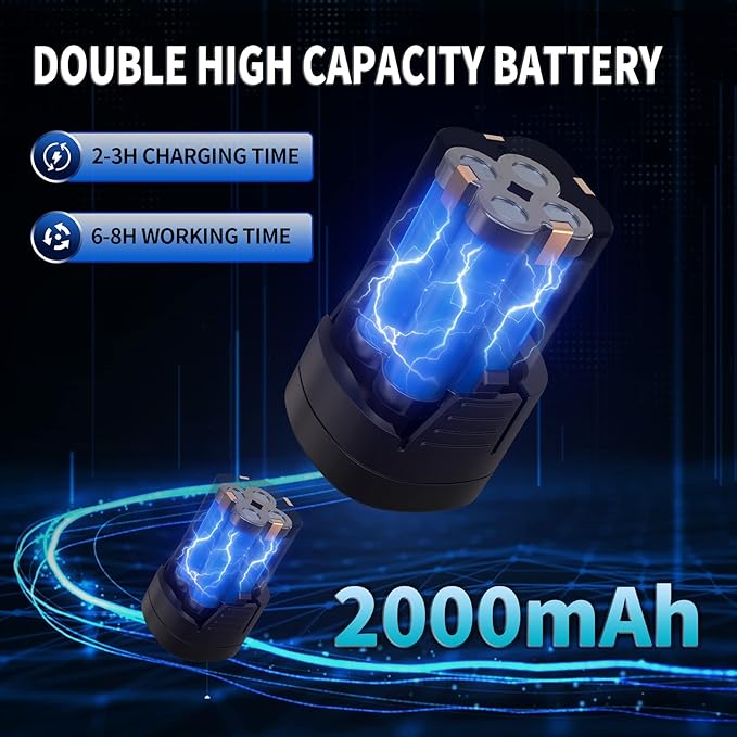 - Long Battery Life + Cooling Vents – Stable, Worry-Free Operation: Comes with two 16.8V 2000mAh high-capacity batteries for 6–8 hours of runtime and supports simultaneous charging. Integrated battery cooling vents keep the handle cool during extended use, ensuring consistent performance and user comfort.