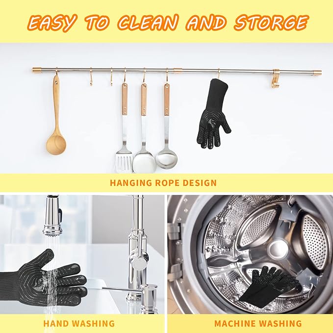 - 🔥【Easy To Clean & Dry】These hot gloves for bbq are easy to Clean. After use, you just need a little soap and the light rubbing to get the oven cooking gloves clean. Feature with strip design makes it easy for you to hang them on a hook, which is easy to dry and help you to store.