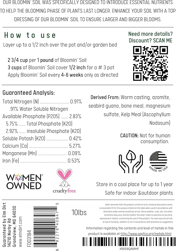 - About the Product: Elm Dirt's Ancient Earth Soil Amendment is a powerful blend of organic worm castings and four of the most bio-active, environmentally-friendly soil-enhancing ingredients. Crafted in the USA, it's designed to replenish probiotics in your potting soil, providing a nutrient-rich salad bar for your plants' growth.