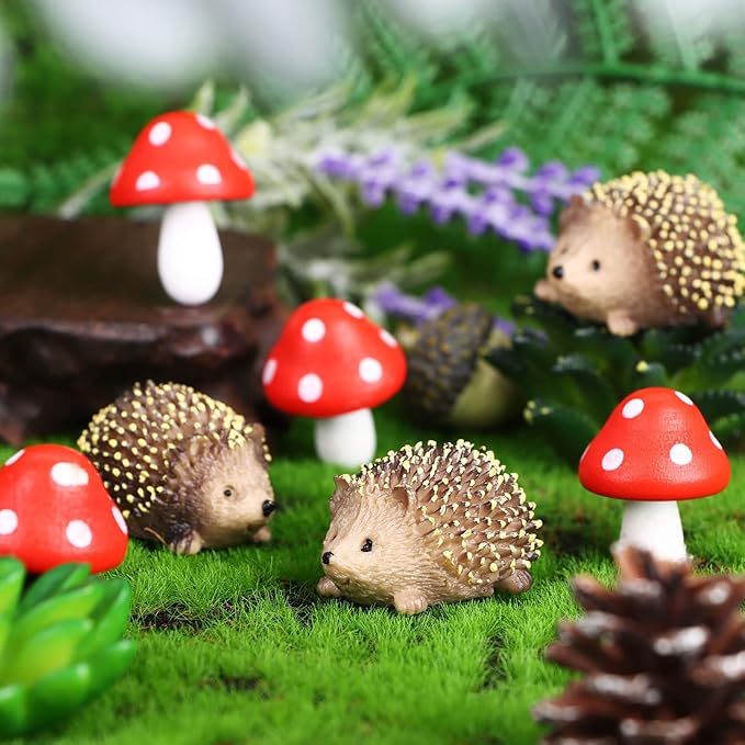 - Mini Hedgehogs and Mushroom: You will get 5pcs fairy garden mushroom figurine and 3pcs cute hedgehog figurine, ideal decoration for miniature landscape flower pot bonsai craft, to add to your fairyland fairy garden.