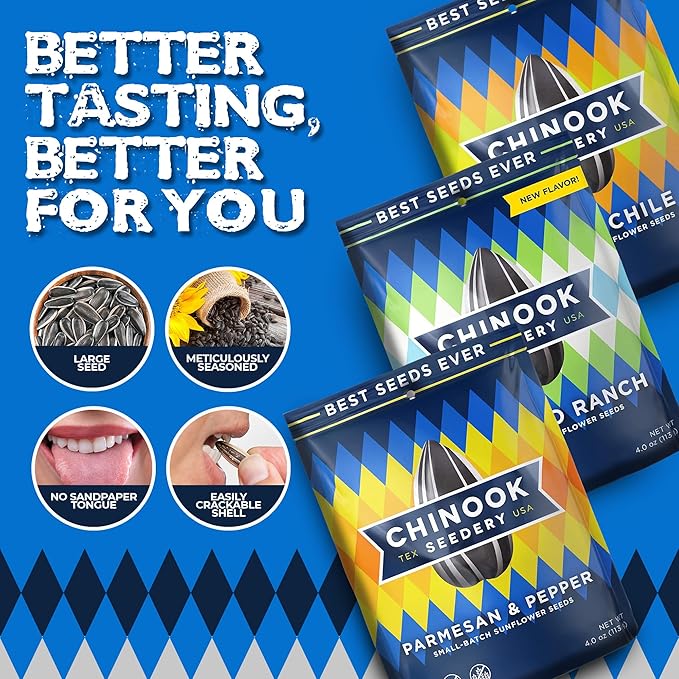 - PRIME CHINOOK SEEDERY: Sunflower seeds are so naturally healthy – full of vitamins, minerals, and healthy fats, Chinook Seedery added a twist to this good snack and created the best-flavored sunflower seeds ever! Want a new kind of seeding experience? Get the best bucket of seeds ever now! If you're a fan of spice and heat, this is the variety pack for you! Contains our spiciest flavors: Parmesan & Pepper, Jalapeno Ranch, & Hatch Chile!