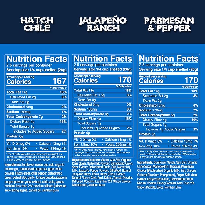 - VARIETY OF GOOD FLAVORS: We have six great of flavors to choose from--Original (Salty), Parmesan & Pepper (Savory), Hatch Green Chile (Spicy), Smokehouse BBQ (Smokey - Barbecue), and Dill Pickle (Sour). All available as 3-packs, each pack contains 4.0 oz. bags of jumbo, low salt sunflower seeds. Makes a great stocking stuffer!