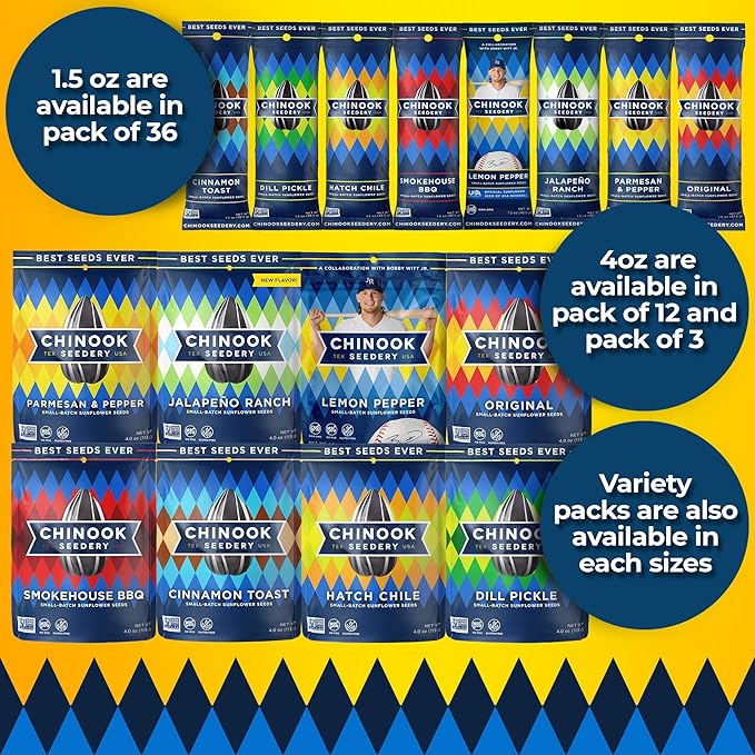 - GREAT FOR GROUP & SOLO EATING: Ideal for baseball, road trips, camping, fishing, hunting, disc golf, & softball. No matter what your adventure, having a bag of Chinook nearby keeps you fueled for success. There's just something about cracking and spitting seeds that put you in a winning mindset. The official sunflower seed of USA Baseball and partnered with Bobby Witt Jr. of the Kansas City Royals, it’s also a perfect snack to have in the dugout at your next baseball game.
