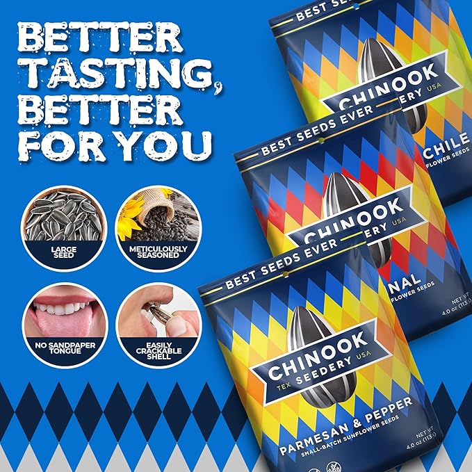 - CHINOOK SEEDERY: Sunflower seeds are so naturally healthy – full of vitamins, minerals, and healthy fats, Chinook Seedery added a twist to this good snack and created the best-flavored sunflower seeds ever! Want a new kind of seeding experience? Get the best bucket of seeds ever now! This variety pack contains our three most popular flavors: Parmesan & Pepper, Original, & Hatch Chile!
