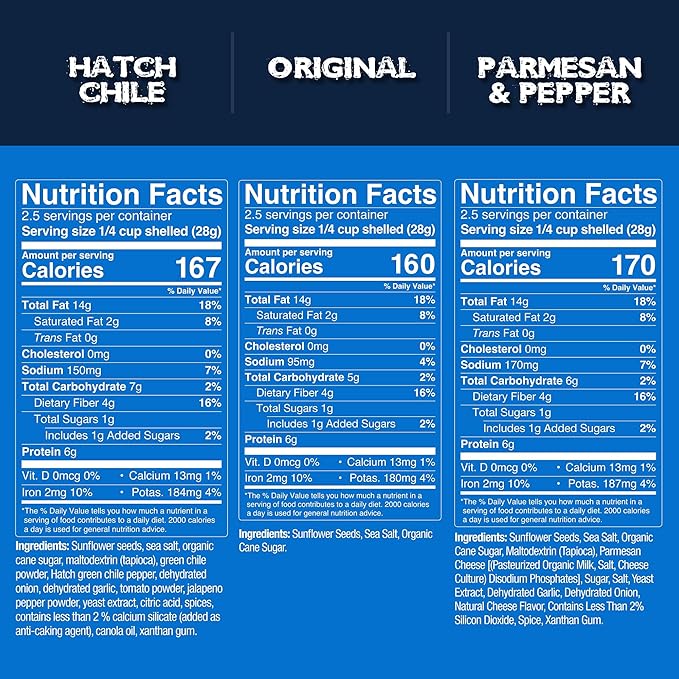 - VARIETY OF GOOD FLAVORS: We have six great of flavors to choose from--Original (Salty), Parmesan & Pepper (Savory), and Hatch Green Chile (Spicy). All available as 3-packs, each pack contains 4.0 oz. bags of jumbo, low salt sunflower seeds. Makes a great stocking stuffer!