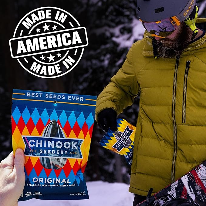 - GREAT FOR GROUP & SOLO EATING: Ideal for baseball, road trips, camping, fishing, hunting, disc golf, & softball. No matter what your adventure, having a bag of Chinook nearby keeps you fueled for success. There's just something about cracking and spitting seeds that put you in a winning mindset. The official sunflower seed of USA Baseball and partnered with Bobby Witt Jr. of the Kansas City Royals, it’s also a perfect snack to have in the dugout at your next baseball game.