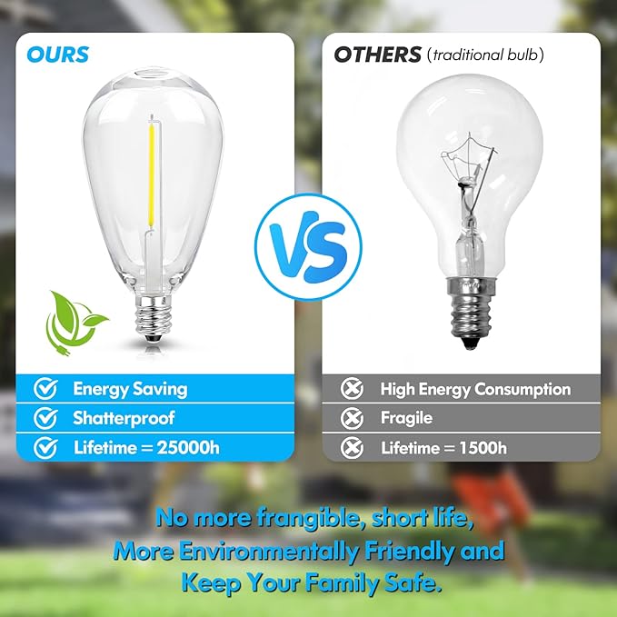 - Energy-Saving & Long-Lasting LED Outdoor Strings: Creating almost the same ambience but with less energy and longer lifetime is a great feature of these LED outside string lights, extremely reduce your electricity bills compared with incandescent bulb ones. What’s more, the long-lasting lifetime of 25000H provided by these patio hanging lights, greatly decrease the times of replacing and more convenient for your life. You will feel surprised and satisfied as long as you possess it.
