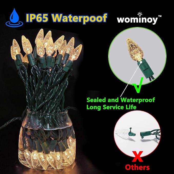 - Warm White Christmas Lights: C6 bulbs are larger than mini lights but smaller than C7 or C9. The prismatic lens provides a bright glow, with a 6.3" lead and 6.7" tail for easy end to end connection