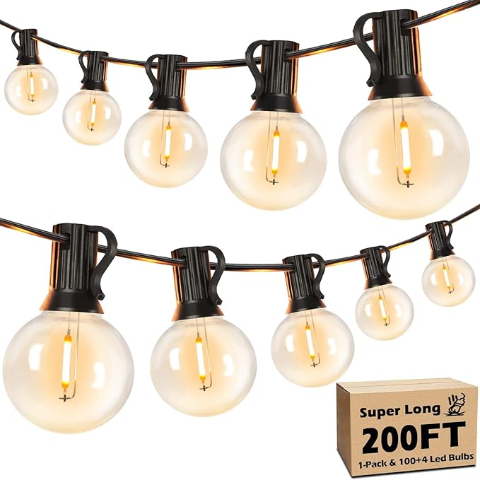 - Totally 200FT Extra Long & Linkable: The outside lights for patio are totally 200ft extra long, come with 100 sockets, 4 spare bulbs are also provided for your backup. Featuring with connectable wire tail, these outdoor string lights support end to end connection up to 7 strands, which is long enough to meet the needs of different scenarios and light up your space