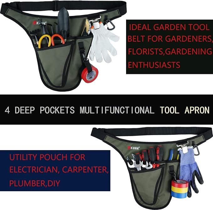 KUNN Garden Tool Belt,Durable Adjustable Tool Belt Waist Pouch with 4 Pocket for Women Men Gardeners Florist Army Green