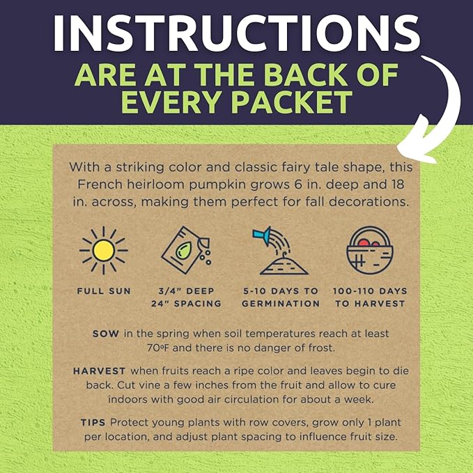 - 6 INDIVIDUAL SEED PACKETS: New England Pie Pumpkin, Cinderella Pumpkin, Jack O' Lantern Pumpkin, Casper Pumpkin, Big Max Pumpkin, Jarrahdale Pumpkin Winter Squash.
