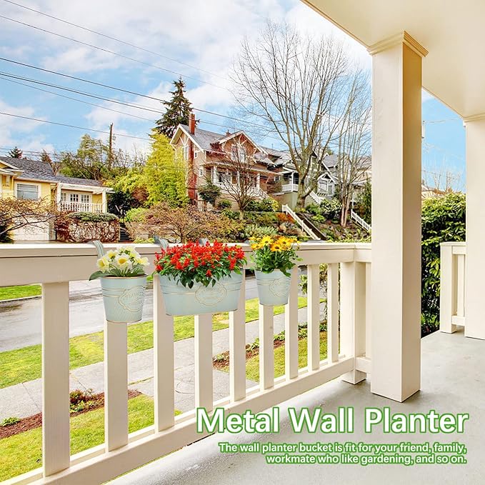 PerGar Vintage Metal Iron Wall Hanging Flower Pots, Rustic Planter Bucket Herb Flower Plant Holder with Detachable Hooks & Drainage Hole for Railing Fence Balcony Deck Garden Home Decoration, Set of 3