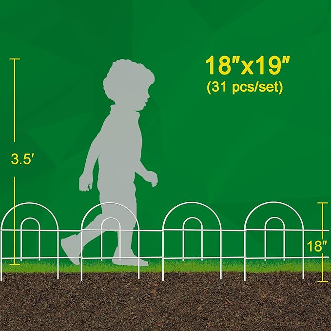 - The folding white garden fence size & material: Panel fence 18” high, overall length 50feet in one set (1set composed by 31 panels), The metal garden border panel made of iron wire inside then powder coated surface outside for rustproof material.