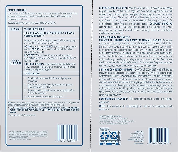 - Usage: Use 1 lb. per 12,000 gallon of water. Shock pool weekly and after heavy use, high temperatures, or rain.