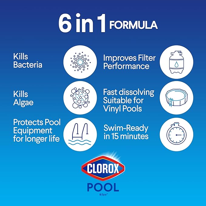 - 6 in 1 Formula: Kills bacteria and algae to maintain a clear swimming pool. Our algae-fighting formula prevents algae for crystal-clear water. Destroys contaminants to aid filter performance and clear dull, cloudy water