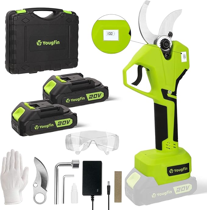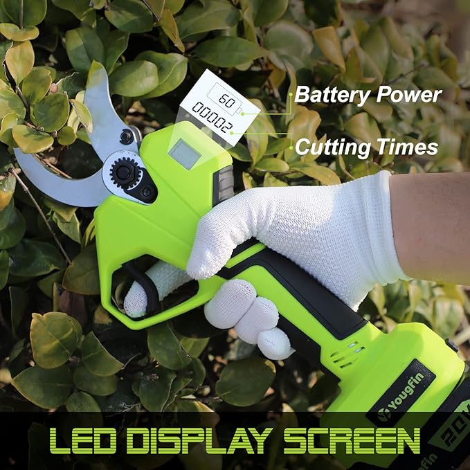 - 【LCD Display & Precision Cutting】: Our Yougfin electric pruning shears features an LCD display, indicating the number of cuts and remaining battery life. With its ergonomic design, it offers a comfortable grip, making it easy to maneuver around branches without straining your wrists.