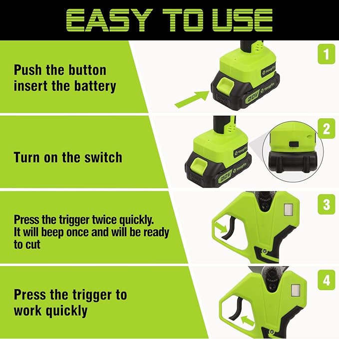 - 【Easy Use & Ergonomic Design】:After pressing the power button, the electric pruner will remain inactive until you rapidly press the trigger twice, which helps prevent accident. If the trigger is not pressed for 60 seconds, the electric branch shears will go into auto-sleep mode to prevent accidental cutting. Quickly pressing the trigger twice returns it to life. The handle is ergonomically designed to offer maximum comfort. It includes cushioned grip for an effortless trimming experience.