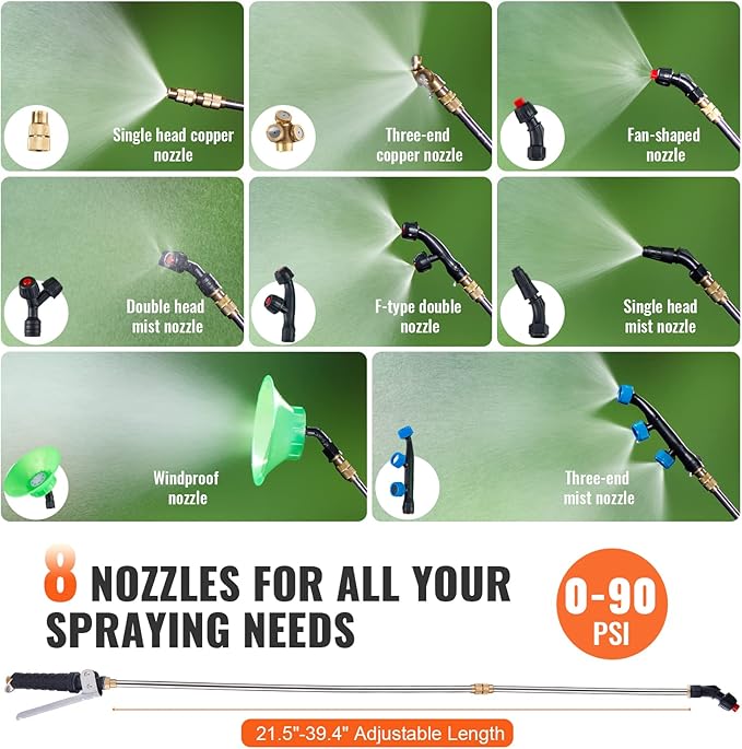 - Multiple Nozzles Available: This electric backpack sprayer 4 Gallon comes with 8 nozzles and 2 wands, giving you more options to choose how you spray! The brass wand features an adjustable length of 21.5"-39.4", and the plastic wand is suitable for bleaching agents and other corrosive liquids. The water pressure can be easily adjusted from 0 to 90 psi via the knob. Our garden sprayer will meet your various spraying needs with no trouble.