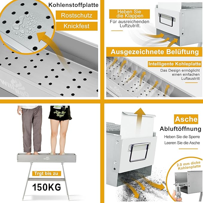 - Foldable and Portable,Strong and High Temperature Resistant:Strong solid body made of alloy steel with 2mm thick coalplate, Steady foldable stand holds up to 150KG.Stand of the barbecue grill is designed to be foldable, you can have the bbq grill anywhere you would like to set up.Handles on both sides also help you move the camping grill with ease.