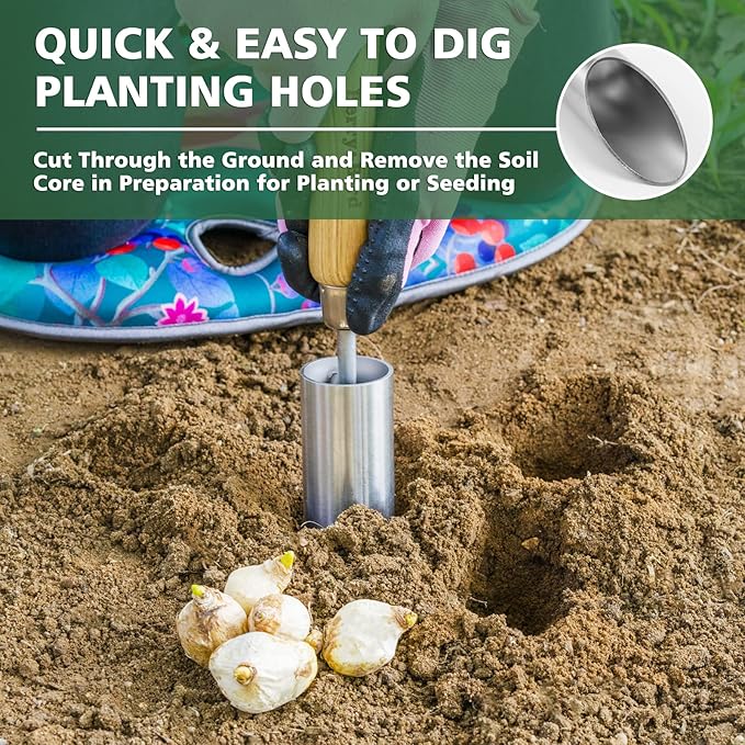 - WHAT YOU GET - 1 * 12“ Bulb Planter Tool. Our garden bulb planter are made by traditional manual process and can be used for more than 10 years. The more the wooden handle and stainless steel will be used, the smoother it will be. It is very suitable for digging solid soil, and the transplanted seedlings have a high survival rate.