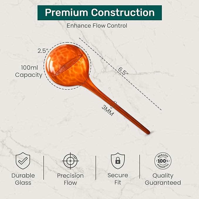 - Eco-Friendly Glass Watering Stakes – Plant Hydration System, Soil Moisture Control, Water Flow Regulated Crafted from durable, eco-conscious materials, our watering globes help regulate water flow for up to 14 days. Optional plastic sleeves help reduce clogging and make soil insertion easier. Ideal for busy plant parents and green thumbs alike.