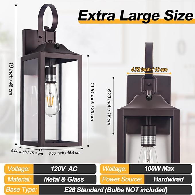 - 【Waterproof & Weather Resistance】: The modern outdoor dusk dawn light is crafted from premium metal, and will not get rusty or corrosive for years of use. It boasts excellent performance in weather resistance, with an IP65 waterproof rating, the extra large outside porch wall light for house can withstand all kinds of bad weather conditions. Even under rain, snow, or ultra-high or low temperatures, you can trust the brown outdoor wall lantern to keep new.