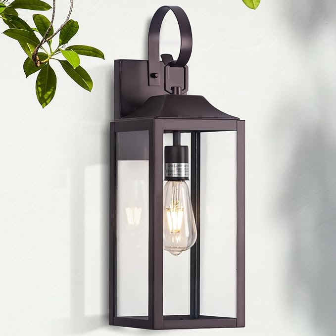 - 【Size & Bulb Compatibility】The bronze outdoor light fixture measures 6 inches in length and width and 19 inches in height. The extra large wall sconce is more economical and can better meet the lighting needs of large spaces. The brown patio wall lantern does not include bulbs. Our exterior wall lamp base is compatible with all E26 bulbs (100W MAX), including LED, CFL, incandescent, dimmable bulbs, etc. The glass shade is pre-assembled and all mounting hardware is included for an easy setup.