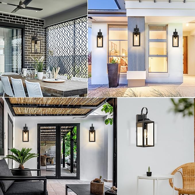 - 【Modern Style & E26 Base Socket】This dusk to dawn outdoor light fixture is slim square, which complements various styles of home decor. Compatible with 100W max E26-based bulbs, including LED, CFL, incandescent, and halogen bulbs. The exterior wall light is open at the bottom for easy light cleaning and bulb replacement. The clear lamp shade can showcase your bulb of choice to create a stunning light outside your home.