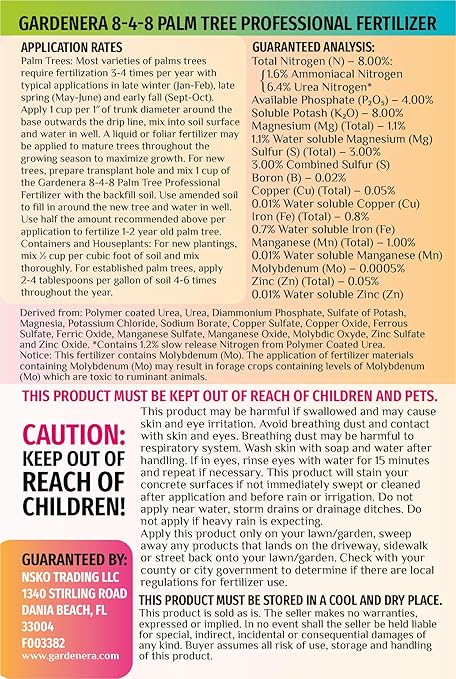 - 🌴 Gardenera Premium All Season Palm, Ixora, and Ornamental Plant Food (8-4-8) is specially formulated with a balanced blend of essential nutrients, including nitrogen (8%), phosphorus (4%), and potassium (8%). This precise formulation provides optimal nutrition for palms, ixora, and ornamental plants, promoting healthy growth, vibrant blooms, and overall plant well-being.