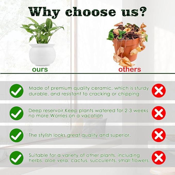- Stylish and Versatile: african violet pot for indoor plants complement any room decor and can be used for an array of plants that need consistent root moisture to thrive. African Violets, Baby's Tears, Pothos, Fittonia, Calathea and herbs like Parsley, Rosemary and Mint will benefit from our self-watering ceramic planter pots