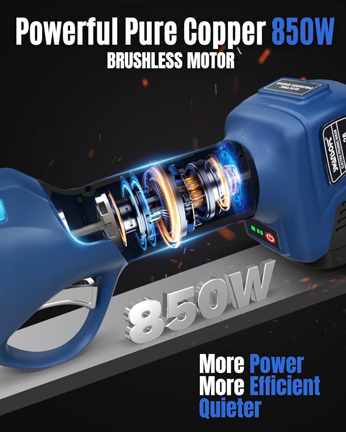 - 【ULTRA DURABLE 100% COPPER BRUSHLESS MOTOR】 - The 850W brushless motor of this pruner is not only more powerful and faster, but also makes cutting branches easier. Additionally, it greatly reduces energy loss and heat generated by motor friction, eliminating the need for carbon brush replacements and extending the service life. It completes one cut in just 0.29 seconds