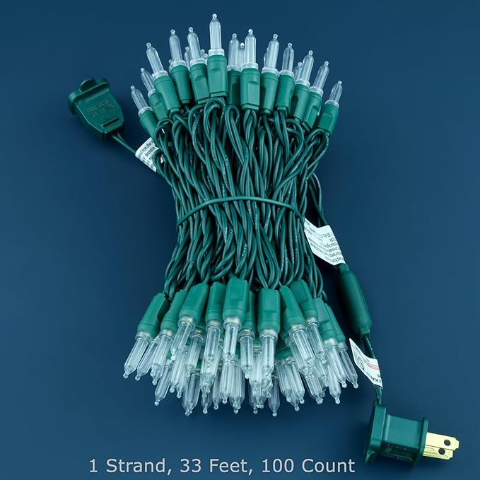 - SPECIFICATIONS ☀ Each pack contains 1 strands of one-piece string lights, total length 33 feet with 100 count cool white mini lights. 22 AWG green cord, 4" lead, 4" spacing, 4" tail.