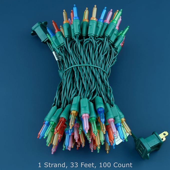 - SPECIFICATIONS ☀ Each pack contains 1 strands of one-piece string lights, total length 33 feet with 100 count multicolor mini lights. Five colors of light bulbs are spaced out, they are red, orange, green, blue, and purple. 22 AWG green cord, 4" lead, 4" spacing, 4" tail.