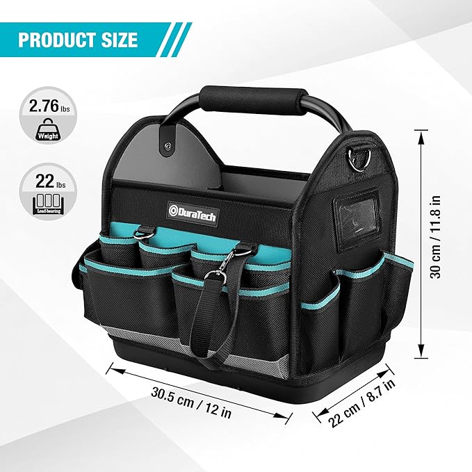DURATECH 12 Inch Tool Tote with Waterproof Hard Bottom, Electrician Tool Bag with Rotating Handle, Open Top Tool Bag Wide Mouth Multi-Pockets, Tool Carrier for Mechanic Plumber Electrician HVAC