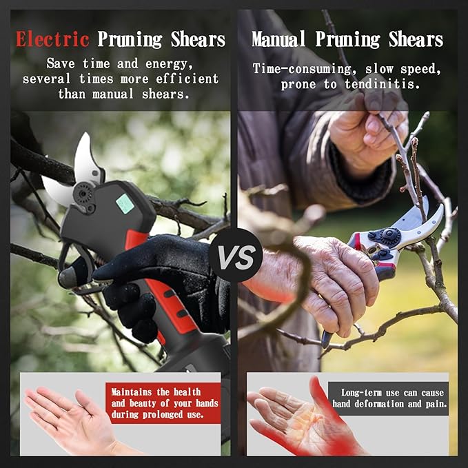 - [Safety protection & quality assurance] To prevent accidents, when using electric pruning shears, you need to pull the trigger quickly twice in a row, and if you do not work for about 1 minute, the scissors need to be restarted, otherwise the blades will not work properly, which greatly reduces the risk of accidental cutting. Professional supervision means we value practicality and quality, and we inspect all products before shipping them, and we strive to ensure that our customers can use them for a long time.