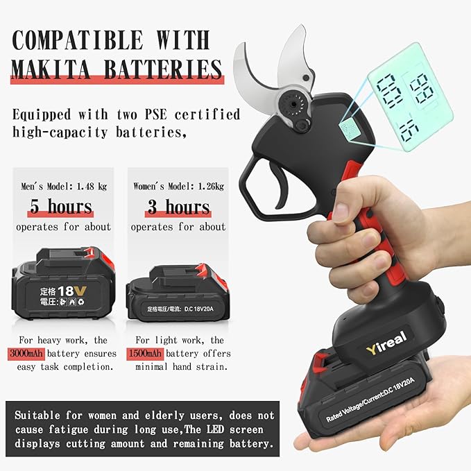 - [PSE certified & compatible with 18V] This rechargeable pruner is ergonomically designed to be light and easy to hold, and two types of batteries are available for women and those with little strength. The female type can cut continuously for about 3 hours with 1.26 kg and 1500 mAh including batteries, and the male type can cut continuously for about 6 hours with 1.48 kg and 3000 mAh. The large capacity of 4500 mAh is enough to handle a day's work. The battery has already been PSE certified, so you can use it safely, and it is compatible with Makita 18V batteries, which is very convenient.