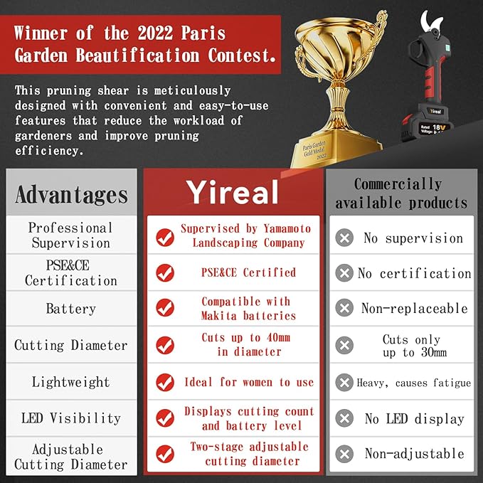 - [40mm cutting diameter & supervised by Yamamoto Landscaping Company] Yireal's rechargeable pruning shears can easily cut branches with a maximum cutting diameter of 40mm. The opening can be adjusted to two stages: half open and full open. When half open, the small opening saves work time and electricity, and when fully open, it is easy to cut thick branches. Our electric scissors were developed under the supervision of Yamamoto Landscaping Company to make pruning work easier for gardeners. Over the past 10 years, it has been used by more than 100,000 gardeners at 20,000 landscaping companies around the world.