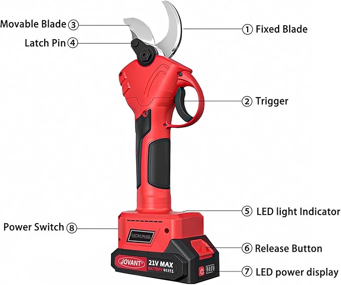 - Adjustable 1.2-inch or 0.8-inch Cordless Pruner: Jovant Cordless Electric Pruning Shears are equipped with 1.2in(30mm) large cutting diameter to handle thick and thin branches with ease -- whether it's 0.8in(20mm) for daily pruning or 1.2in(30mm) for thick and hard branches, you can cut them off accurately with one touch and say goodbye to the inefficiency of sawing over and over again!