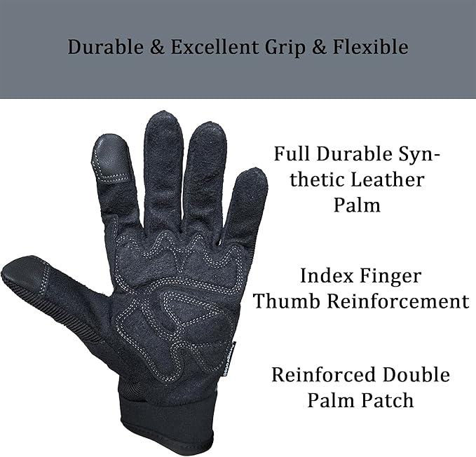 - [ More Protection ] - Double Foam Padded Palm Patch & Reinforced Fingertips and Thumb & Durable Synthetic Leather Fourchettes. The double foam padded palm patch absorbs impact and vibration. Reinforced fingertips and thumb may protect your fingers from any related potential hazards