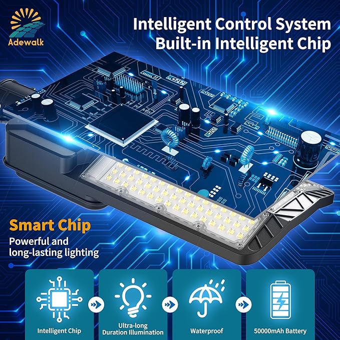 - Super Bright Solar Street Light: Adewalk solar street light Equipped with advanced Optical lens-focused LEDs that deliver far-reaching, intense brightness—significantly outperforming standard beads. Combined with a wide multi-angle lighting design, it evenly covers up to 5000 sq.ft with no dark zones. It is very suitable for large-scale lighting applications such as parking lots, driveway, warehouse, and big yard