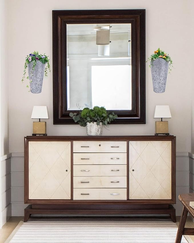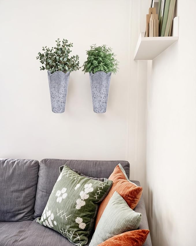 - 【12-Inch Galvanized Wall Vase Set】 – Includes 2 silver galvanized metal wall planters, each measuring 11.8" tall with a 5.9" top diameter and 3.6" bottom, perfect for rustic and farmhouse home decor.