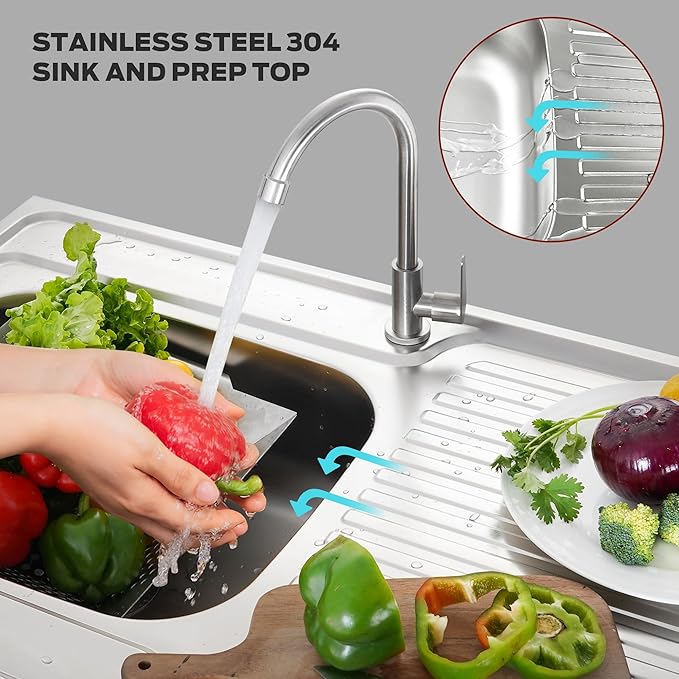 - 304 Stainless Steel: Table top is made of 304 stainless steel for long term using and easy cleaning. Can contact water or food directly in safe. Integrated sink connected with drainboard seamlessly. Perfect as your outdoor sink station