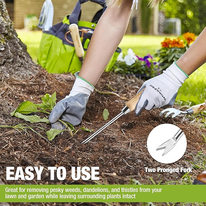 - Easy to Use: The handheld weeder tool removes weeds from your garden, including stubborn weeds like dandelions and thistles. The stainless steel tow-pronged fork cuts through weeding roots with ease, allowing surrounding plants to grow healthily and thrive