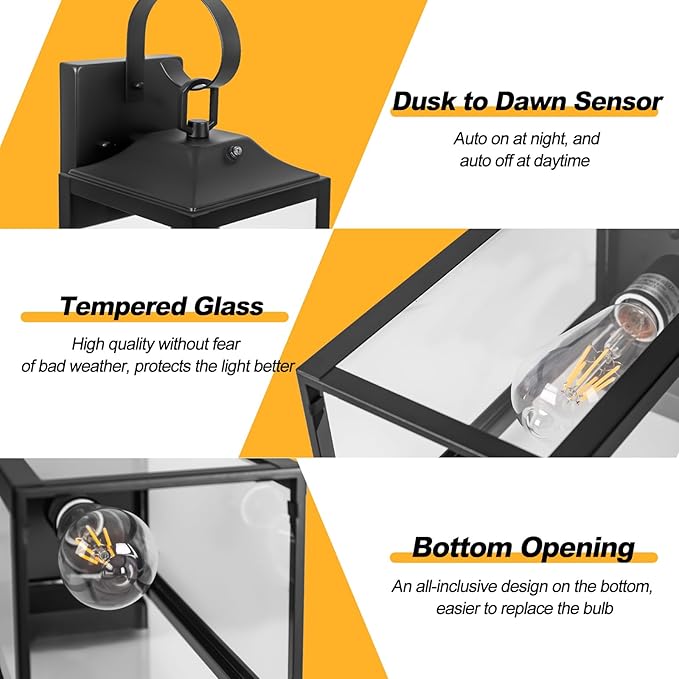 - 【Easy Installation & Wide Application】The glass of this outdoor wall lamp is pre-assembled, and all mounting accessories are included for quick installation. Detail install operations please refer to the user's manual. The thoughtful open-bottom design makes it particularly easy for bulb replacement. This dawn till dusk sensor wall sconce can apply on the porch, patio, garage, courtyard, garden, street, and hallway.