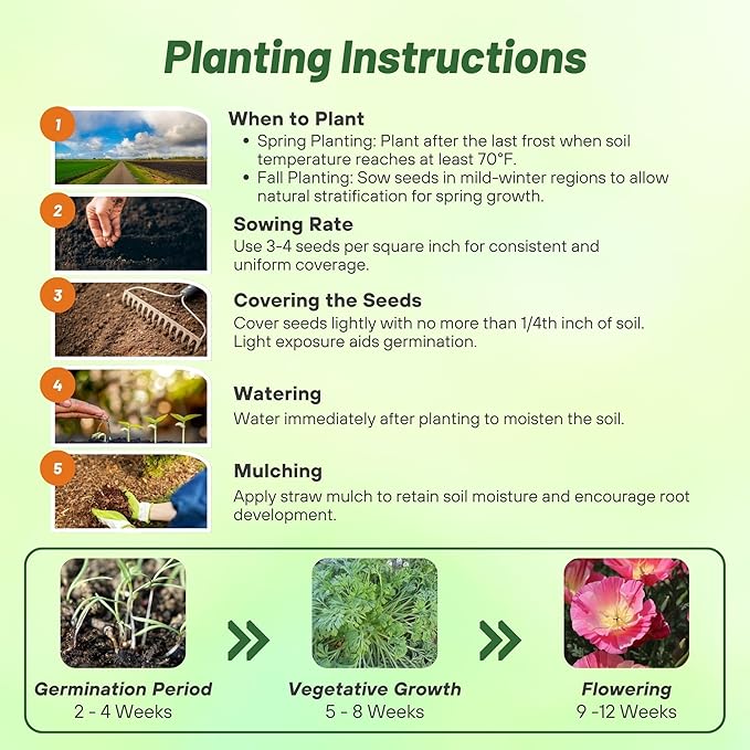 - EASY GROWTH & LARGE COVERAGE: These poppies are perfect for xeriscaping, garden borders, or containers. With their ability to flourish in poor soil and need minimal watering, Use wildflower seed packets for smaller gardens or packs for up to 50 square feet, making it easy to create dense, colorful displays that attract beneficial pollinators.