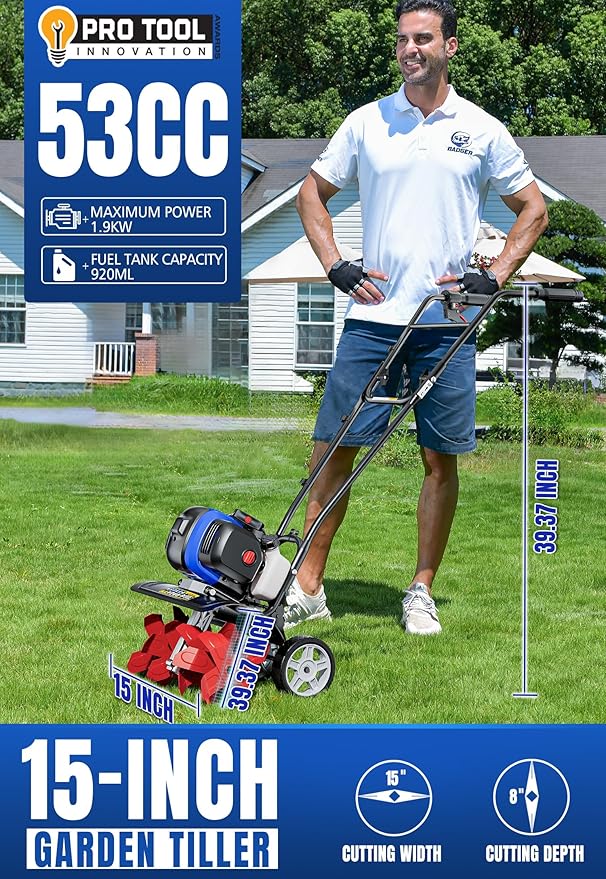 Wild Badger Power Garden Tiller 53cc Mini Cultivator 15 inch Powerful Liftable Booster Rod Tilling Tool for Lawn, Garden and Field Soil Cultivation