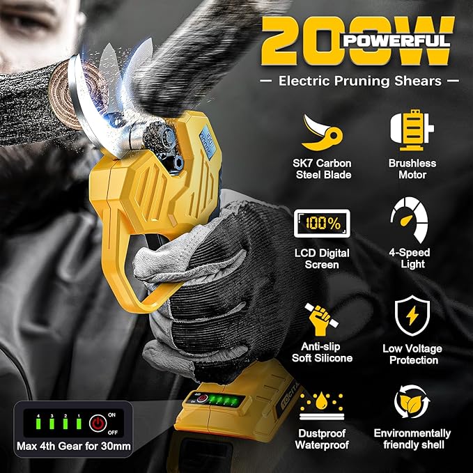 - ADJUSTABLE SPEED:This cordless 20V max power electric pruningis equipped with MAX 2,6000RPM brushless motor,electric pruner has 4-speed digital display screen. It can easily handle tough cutting diameter,Wire cutting for gardening tree branch with ease,making it a must-have tool for professionals and gardener enthusiasts alike.