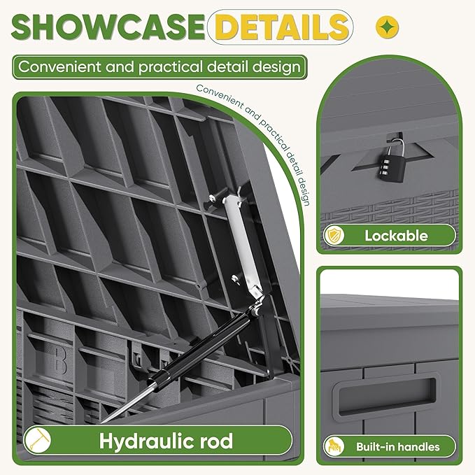- Weather-resistant Material: This storage box is made of PP material with a wood grain finish, offering excellent fade resistance and corrosion resistance