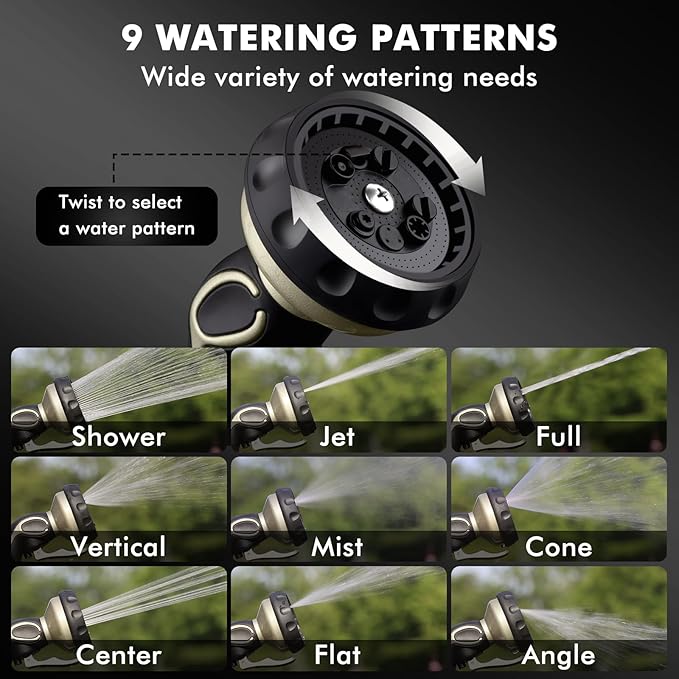 - 【9 Watering Patterns】Rotate the sprayer head dial to select a water pattern from Shower, Flat, Full, Mist, Jet, Center, Cone, Angle and Vertical. Whether you need the high-pressure jet to clean your patio, the useful angle to wash your car, the gentle shower to wash your dog, or the soft mist to water your garden flowers, the 9 patterns have you all covered.